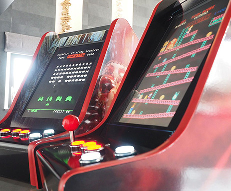 Cet espace à la décoration douce dans les tons beiges et blancs vous propose une borne de jeux d'arcade en libre accès vous proposant les 64 jeux mythiques de l'époque (Pacman, Donkey-Kong...).